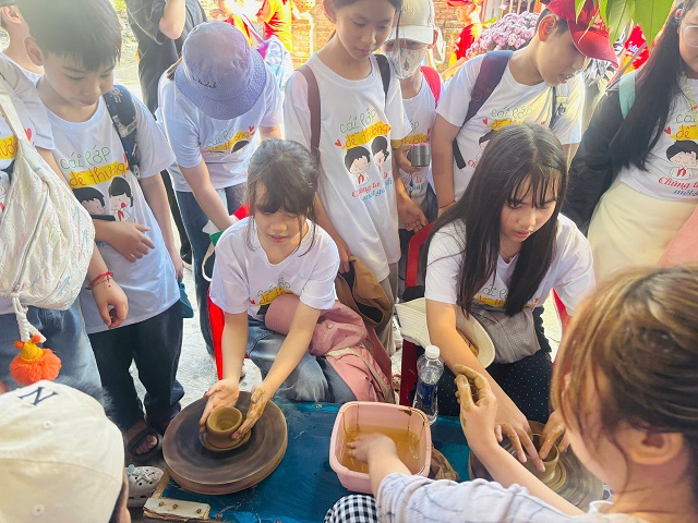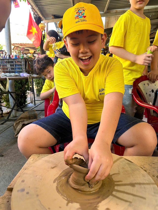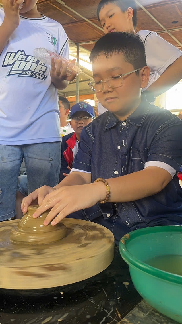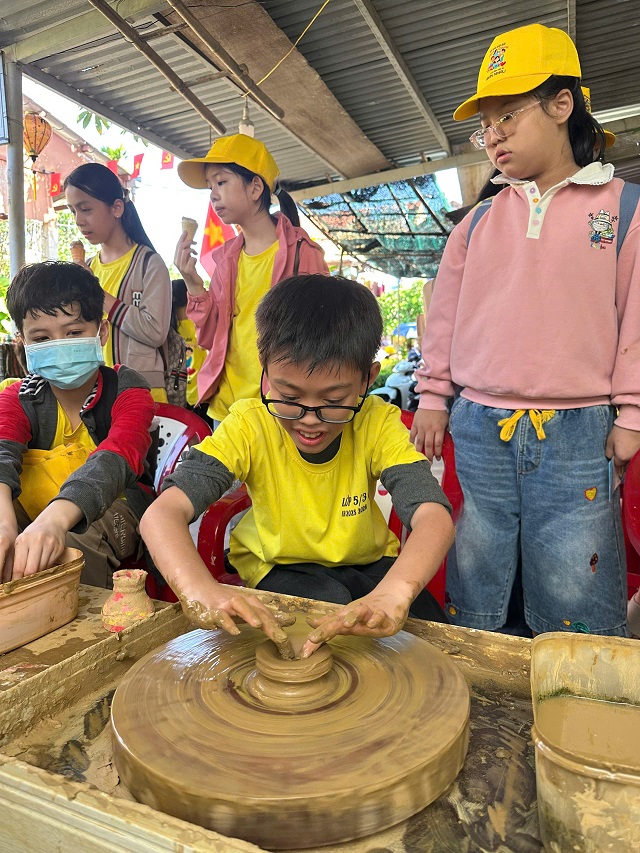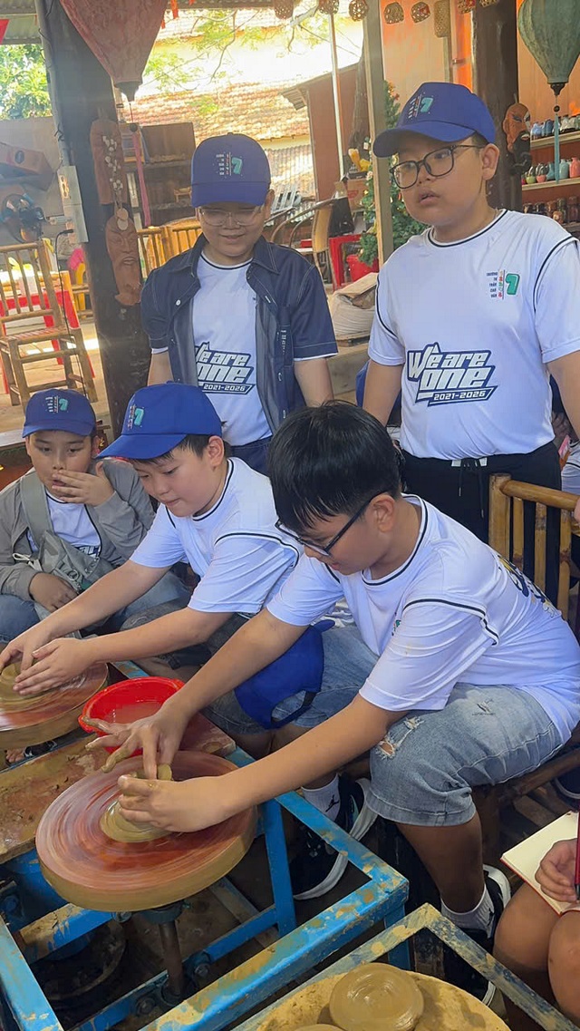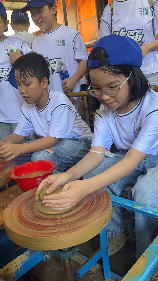 Thứ Bảy, ngày 28/02/2026, hơn 250 học sinh khối lớp 5 của nhà trường đã tham gia chuyến tham quan, trải nghiệm tại các làng nghề truyền thống. Điểm đến đầu tiên của các em là Làng gốm Thanh Hà, nơi các em được tìm hiểu về lịch sử hình thành, quy trình làm gốm truyền thống và trực tiếp trải nghiệm tạo hình sản phẩm gốm dưới sự hướng dẫn của các nghệ nhân. Từng em học sinh hào hứng khi được tự tay nhào nặn đất sét, tạo nên những sản phẩm nhỏ xinh mang dấu ấn cá nhân. Bên cạnh đó, các em còn được tham quan và trải nghiệm đan chiếu cói, một nghề thủ công truyền thống của địa phương. Dưới sự hướng dẫn tận tình của các nghệ nhân, các em đã thử sức với những thao tác đan chiếu cơ bản, qua đó hiểu thêm về sự tỉ mỉ, khéo léo và công sức của những người thợ làng nghề.