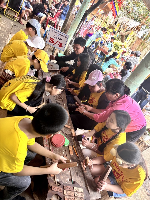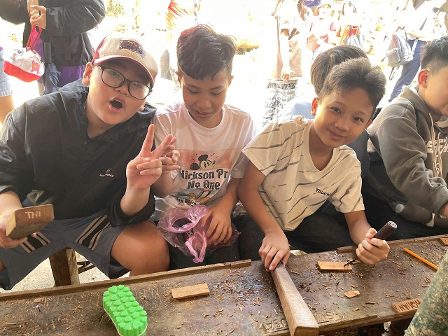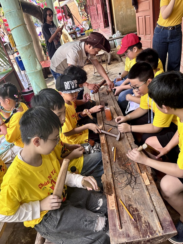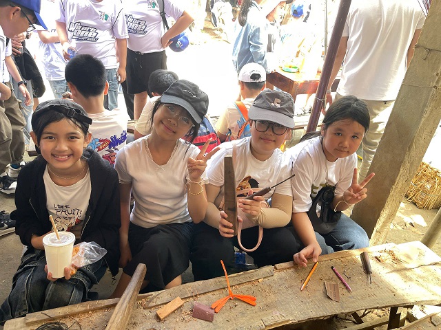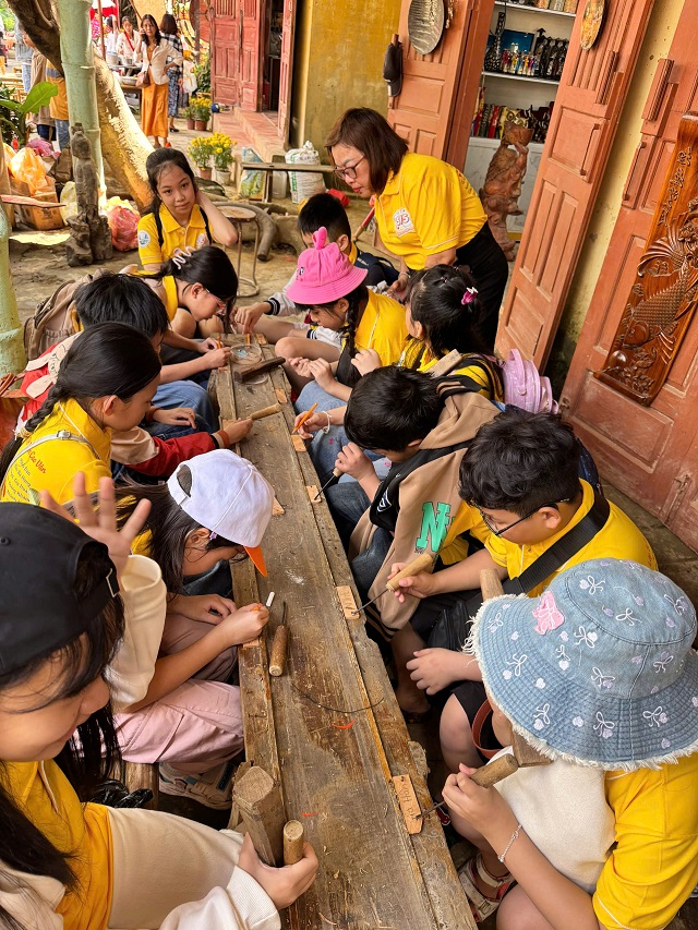 Một hoạt động thú vị khác trong chương trình là tự tay chạm khắc tên của mình lên các thẻ gỗ, giúp các em lưu giữ những kỷ niệm đáng nhớ của chuyến đi. Những sản phẩm nhỏ bé nhưng chứa đựng niềm vui, sự tự hào và tinh thần sáng tạo của các em học sinh.